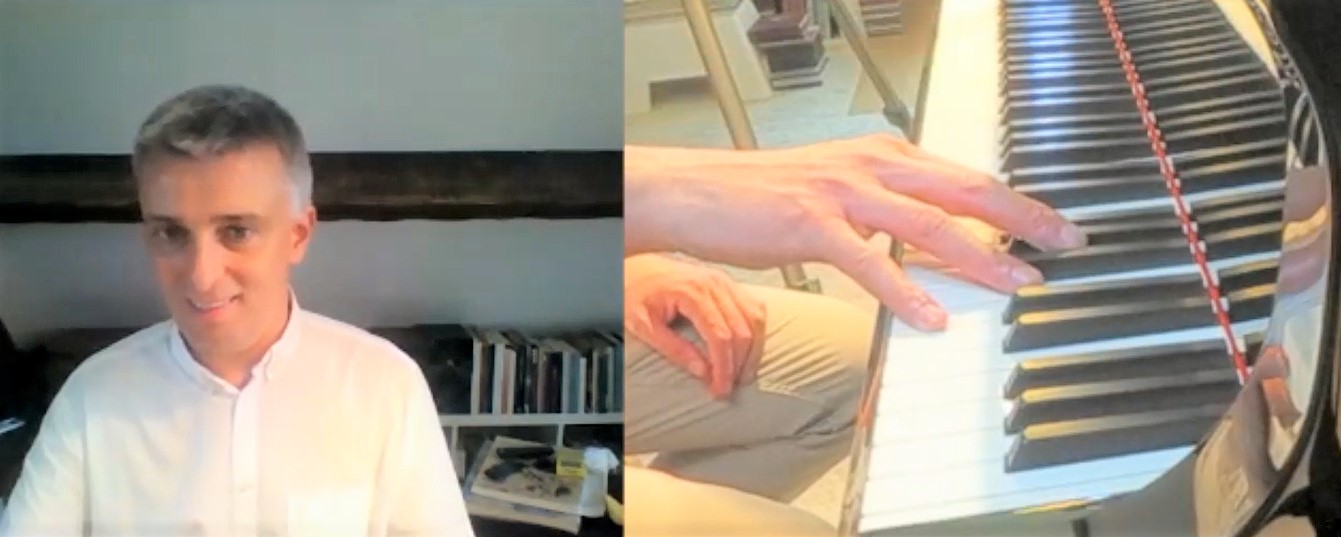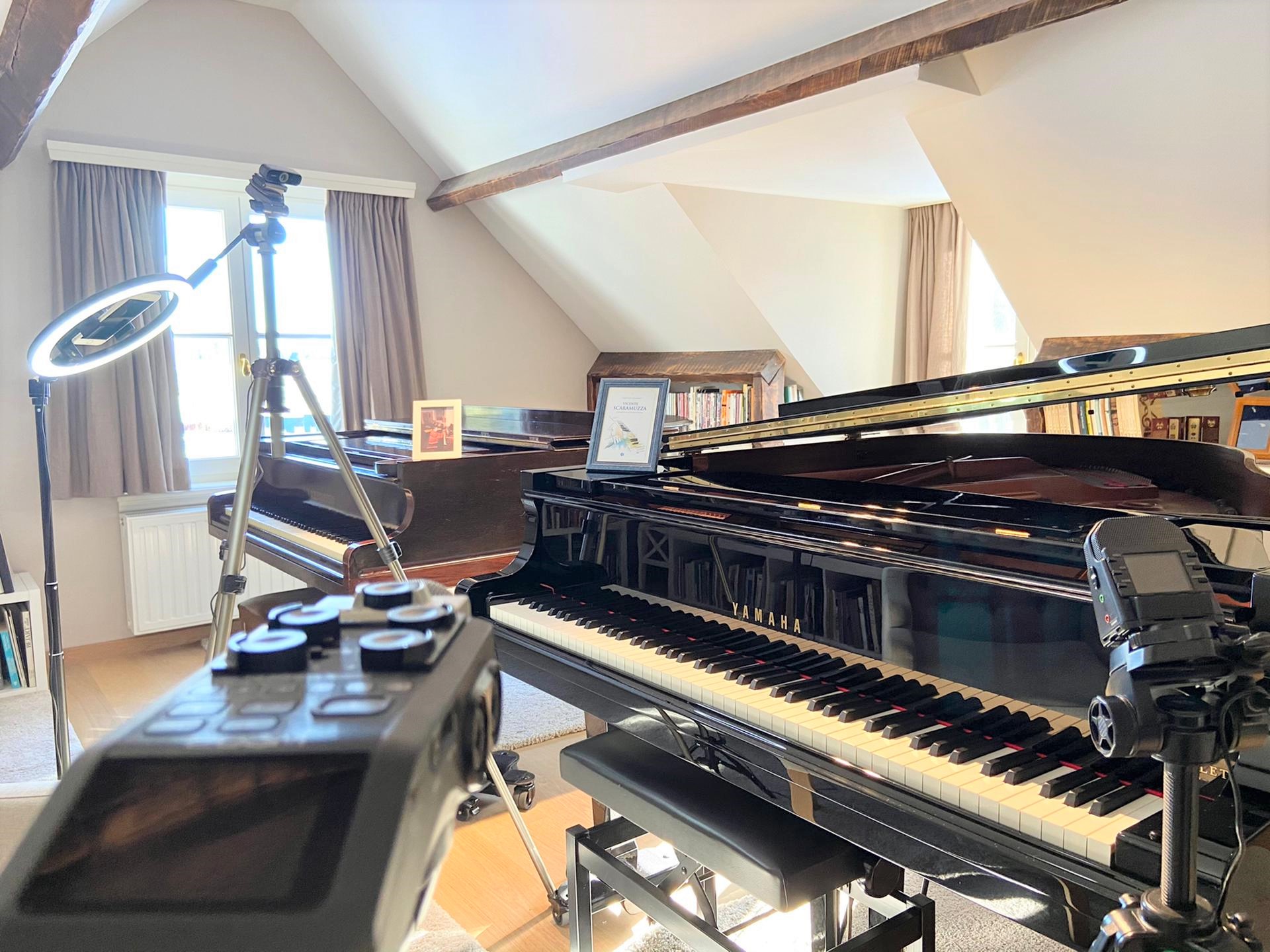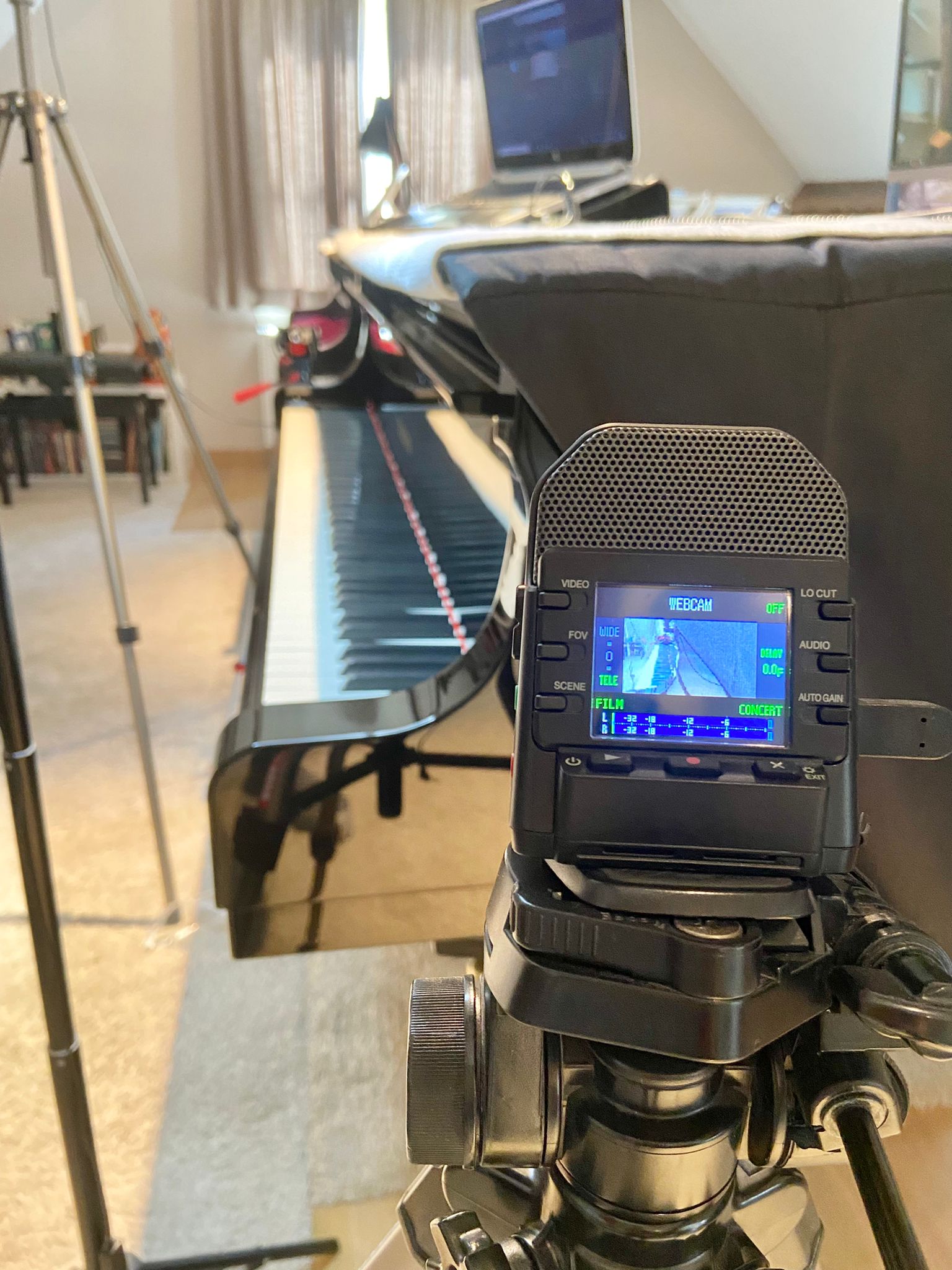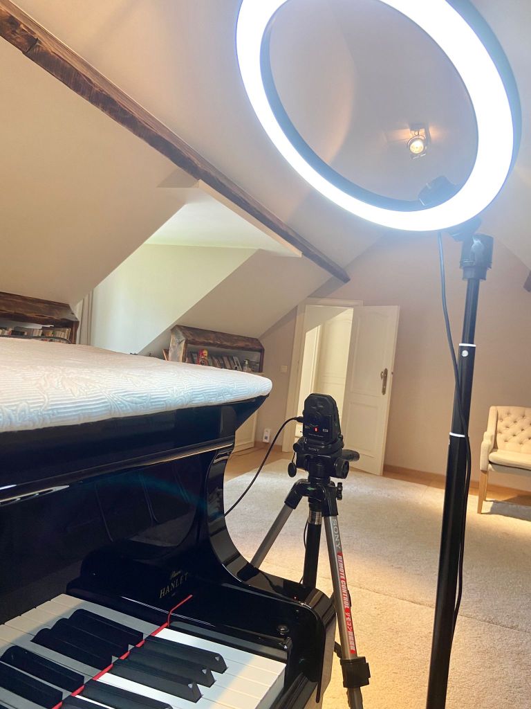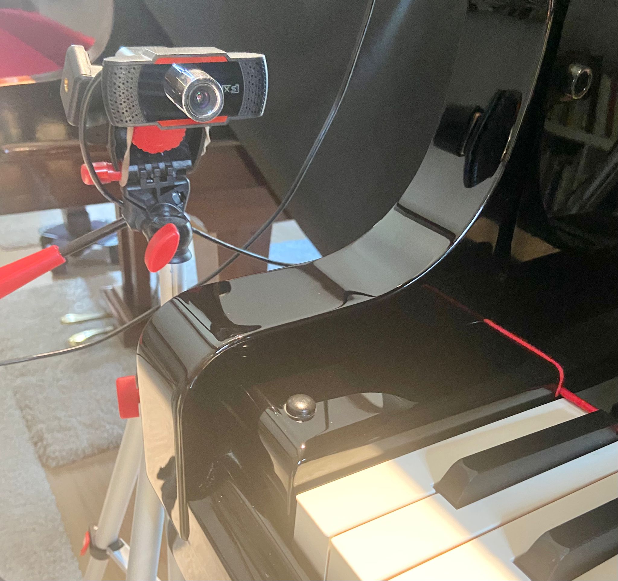 Using Skype or ZOOM digital platforms, my students receive 4 views of me: face, aerial full keyboard, and hands from the right and left. This is possible thanks to the interaction of 4 cameras: the one from the PC, a “ZOOM Q2n 4K” (special model for musicians), and two additional webcams.