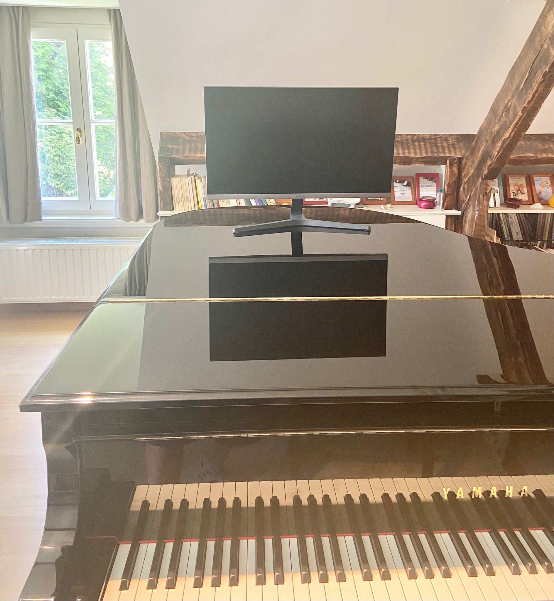 The virtual camera program (OBS Studio) allows direct sending of the different views of the keyboard and of myself, always connected to the best audio quality. In turn, to better receive the video-audio material transmitted by my students, I placed a large monitor on my grand piano, with audio output to the 4 speakers of my audio equipment.
